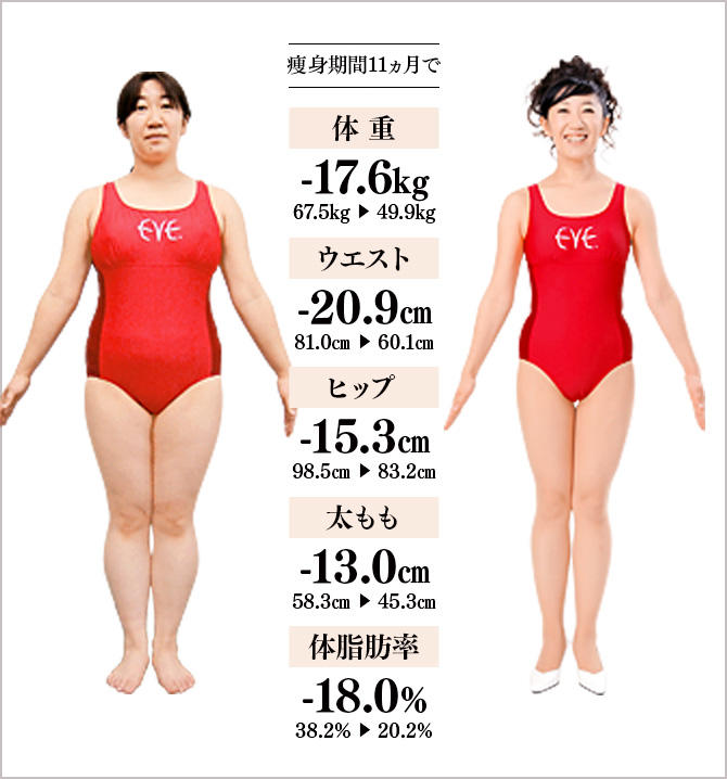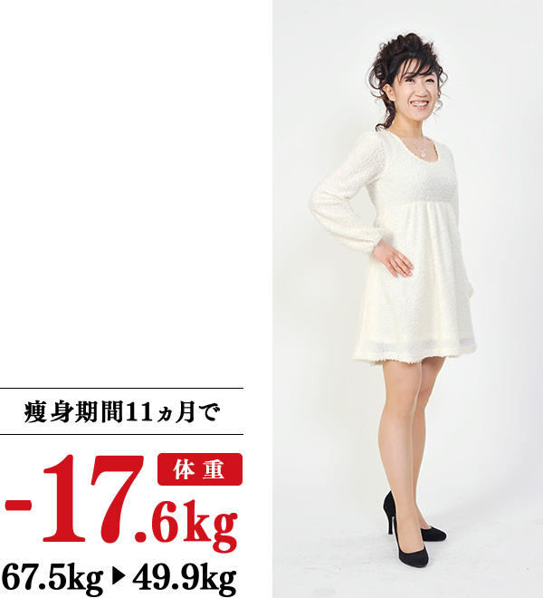 小学生の頃はガリガリ。25歳までは標準体型だったのに、デスクワークが増えた約7年間で15kg増加…。細かった自分に戻りたくて、初エステに行きました。イヴでは、たくさん汗をかいて気持ちもスッキリしながら、1回で1〜2kg減ることに、びっくり! また、すべての施術が「健康的にやせる」ということに注力していて、ストレスもなくやせられました。夏には、海に行き、水着に!!さらにやせ、理想体型になれたので、子どもの頃にテレビや映画で見て以来、長年の夢だった「スポーツカーから降りてくるスレンダーな女性」風にお洒落を楽しみます。