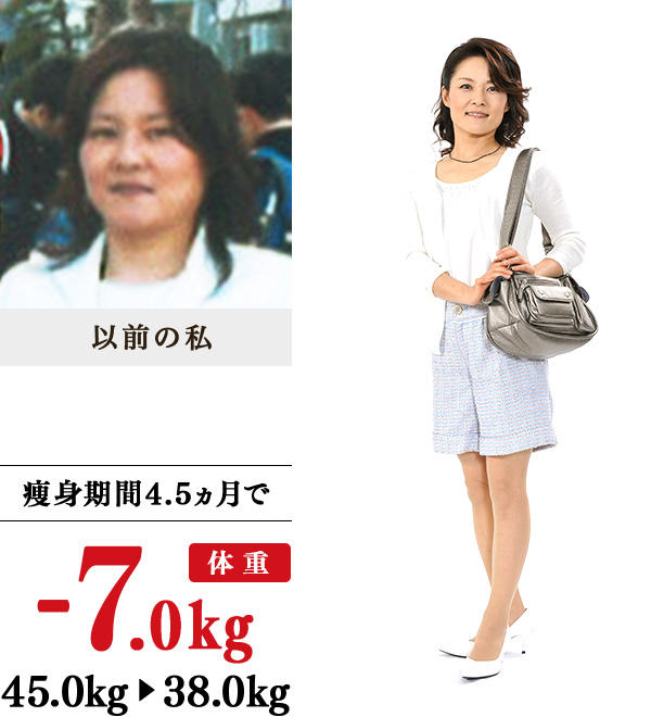 仕事中にぎっくり腰になり、動くことができず半分寝たきりの生活に。病状が落ち着いたので介護の資格を取り、仕事を始めたら悪化してしまい、身体障害者1級に認定されました。歩行も、左手で物をつかむことも困難な日々…。2本の脚で歩くということの大切さを身をもって実感したので、体重よりもサイズダウン目的でイヴを訪ねました。イヴは、東洋と西洋の良い部分をそれぞれ取り入れており、先生方の知識・技術力も高いので、安心して通うことができました。先生たちは常に生徒全員に目を配ってくださり、みんなでキレイをめざすオープンスペースの教室の雰囲気にも満足。20代の頃にエステで働いていた私が求めていたすべてがイヴにあったのです。一年前は、杖がないと歩行が困難でしたが、痩せた今では、杖をつかわずに長く歩けるようになりました。周りの視線も気にならなくなり、自信が持て、第2の人生のスタートがきれました。
