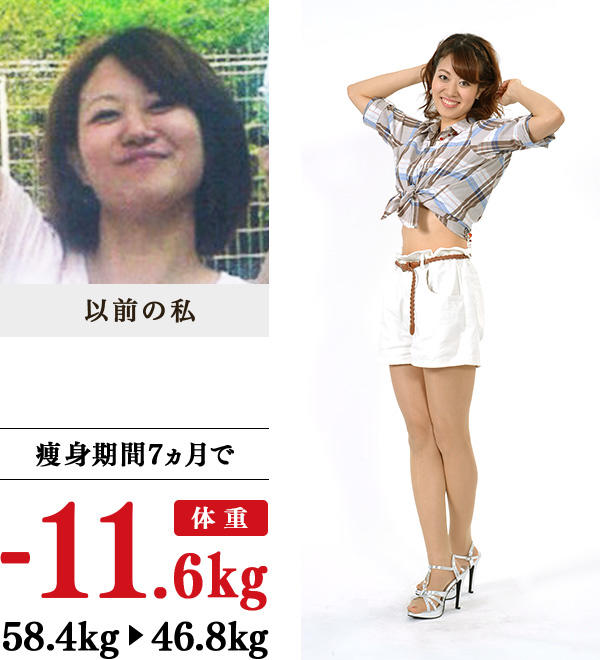 小学3年生頃から肥満で、最大体重は22歳の60kg。家族や友だちに「デブ」と、彼氏からは「俺より脚、太くない?」といわれたことも…。ジムやエステに行っても痩せられず、1年前に着ていた洋服が着られない、かわいいと思った服が必ずといっていいほど入らないということが続いたので、イヴに通うことにしました。温式健康やせがモットーの教室は暑く、慣れるまで大変でしたが、汗がたくさん出て、終わったあとには肉質が柔らかくなり、お腹もへこみ、毎回効果が実感できました。一人での痩身とは違い、毎日、食事や実践したホームケアを生徒手帳に記入し、アドバイスをくださる先生たちのサポートもあり、予想以上の減量に成功!食事をきちんととりながら、脱ポッチャリできたのもよかったです。