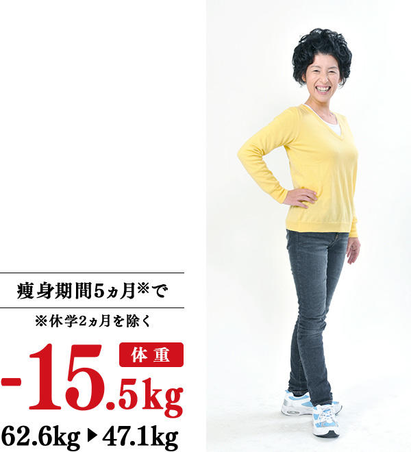幼稚園に勤めているときに、子どもたちに「先生、なんで太っているの?」と言われたことが、やせようと思ったきっかけ。イヴのオープンフロアの教室では、他の生徒様の様子がよくわかり、一人ではないことで頑張ろうという気持ちにもなれました。通学1ヵ月で5.4kg減と、おもしろいほど体重が落ちたので、家でも、食べ方に気をつけるようになりました。最初は怖かった水分のとり方も、先生のアドバイスで気にならなくなり、食べたい物は食べるまったく無理のない生活を送りながらも、体重減。無理せず、たるみなく、健康的に、元気なままやせたことに、友人にも驚かれました。