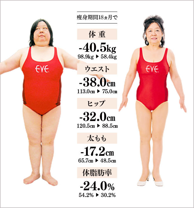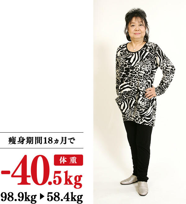 10年前の禁煙後から徐々に体重が増え、100kgを目前に危機感を感じ、同時に自分一人ではダメだと思い、イヴへ入学しました。教室では、想像以上に体のことを考えた、オンリーワン施術プログラムと先生方のサポートを受け、家では、食事指導やブラッシング体操、半身浴などのアドバイスを実行し、通学1年で30kg減。40kgやせた今では、血圧が下がったことで薬が減り、血糖値も理想値になり、主治医に褒められました。また、夜、トイレに起きなくなった、歩くことが苦にならない、肌までモチモチ&スベスベになるなどの嬉しい変化も。今年から、水泳やヨガを定期的に行いたいと思います。