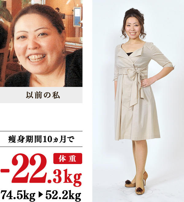 中学生頃から太り始め、以降、太っていることで、何となく自分に自信が持てない日々…。絶対に痩せようと覚悟を決め、イヴに来店したら、初対面の先生方の挨拶がとても心地よかったので、入学することを決めました。その日の体調にあわせて施術メニューを決めてくださるのが効果的だと感じながら、1ヵ月で5.9kg減、2ヵ月半で10kg減!痩せたら、疲れにくくなり、顔まで小さく、肌荒れも少なくなりました。洋服は、体型を隠す15号から9号になり、自分が魅力的に見えるデザインを選ぶように。自信が持てるようになり、素敵な彼氏もできました。