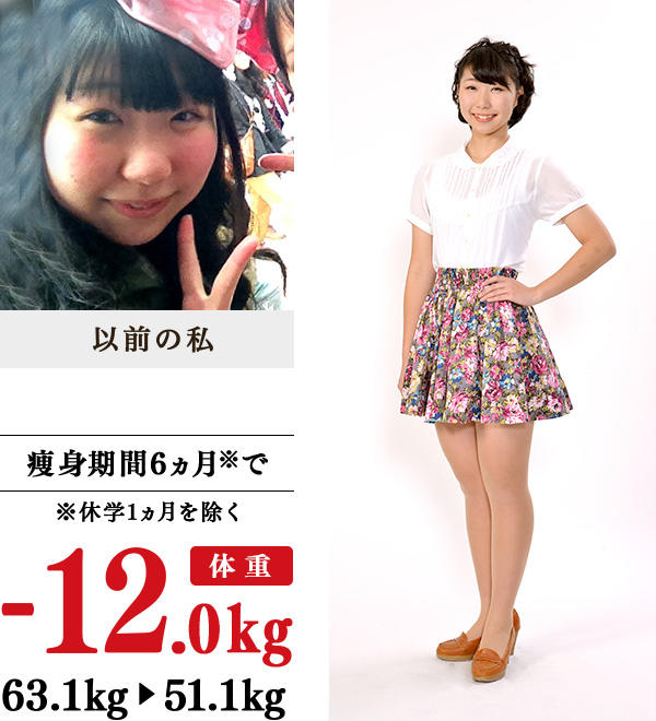 中学3年生頃から、友だちとの外食や偏食が原因で体重が増加…。痩せたいと思っていたけれども、小学生時代からバレーボールで鍛えた筋肉質の下半身は変えられないと諦めていた私に、母がイヴを勧めてくれました。通い始めると、一生懸命トリートメントしてくださる先生方のすばらしい技術と温かい励ましで、目標以上の12kgの減量に成功!今までは、あまり脚を出さなかったのですが、セーラー服の制服のスカートも短くし、かわいく着こなせるようになりました。友だちに、「かわいくなった」といわれたのも嬉しかったです。前向きで明るくなり、自分に自信がもてるようになったら、新たな友だちが増えました。