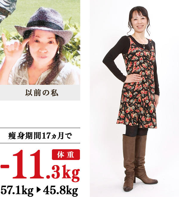 4年前から下半身中心に太り始めました。11号の洋服がキツくなり、好きな洋服が選べず、マイナス思考にも…。初エステのイヴは、アットホームな雰囲気で、高い技術力と熱意のある先生方が、とても親身にサポートしてくれました。家では、水分のとり方や、脚に重点をおいたブラッシング体操、走るよりも歩くなどのアドバイスを実行。痩せたらパンツが似合うようになり、ブーツを履くとパツパツだった脚との間にすき間ができました。気持ちも明るくなり、年齢に対するコンプレックスも減りました。高校の同窓会で、「変わらない」といわれたのも嬉しかったです。