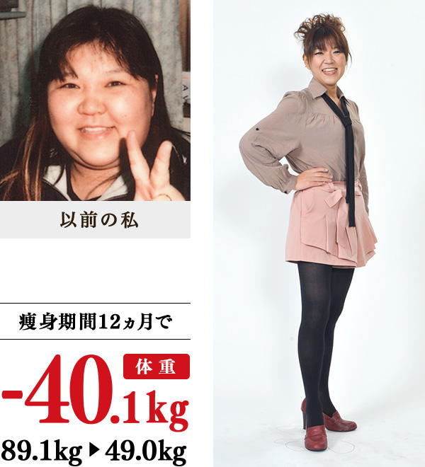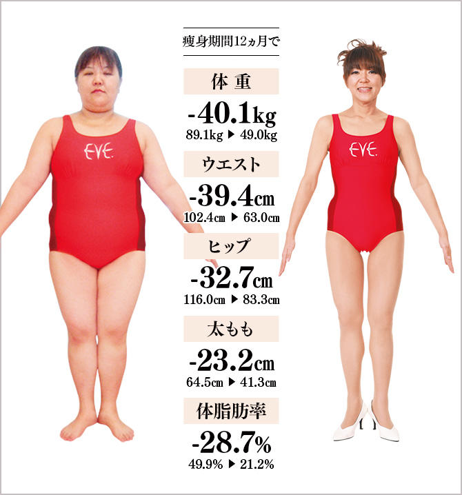 高校卒業後、大阪で一人暮らしを始めてから深夜の過食が原因で、最大時110kgの肥満体に。11年前にハワイで結婚式を挙げたときも100kgあり、ドレスの選択肢は2着だけ…。ふいにウエディングドレスの写真を撮り直したくなり、イヴに入学しました。4ヵ月で15kg減した頃から便秘や生理不順が解消し、顔も毛穴が締まり、キレイな肌色に。 40kg痩せたら、洋服は体型を隠す21号から、9号のフィット系のミニスカートやスキニーに激変。1月にはリレーマラソンに出場し、今後は大阪マラソン出場やヨガの講師養成講座への通学も予定しています。