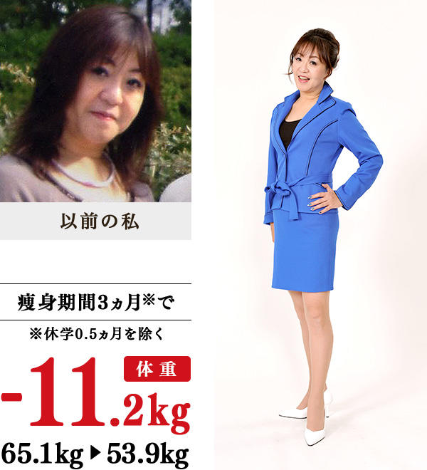 40歳過ぎから、子育てや仕事のストレスを、食べて、飲んで発散していたら太り始めました。炭水化物抜きで3kg痩せたけれども、すぐにリバウンド…。息子の、「お母さん、痩せたほうがいいよ。もう限界だよ」の言葉に、あれこれ悩んだ末、イヴを訪ねました。教室では、先生方が親身になって考え、一生懸命、施術をしてくださるのを、ありがたく感じながら、11.2kgの減量に成功し、10年前の体重に!洋服は13号から9号に変わり、ミニスカートやピッタリした服を着るようになりました。息子たちが、「友だちのお母さんより一番キレイ」「デートしよう」といってくれたのも嬉しいです。自分の体験をもとに、痩せたい人にアドバイスをしたいと思うようになりました。