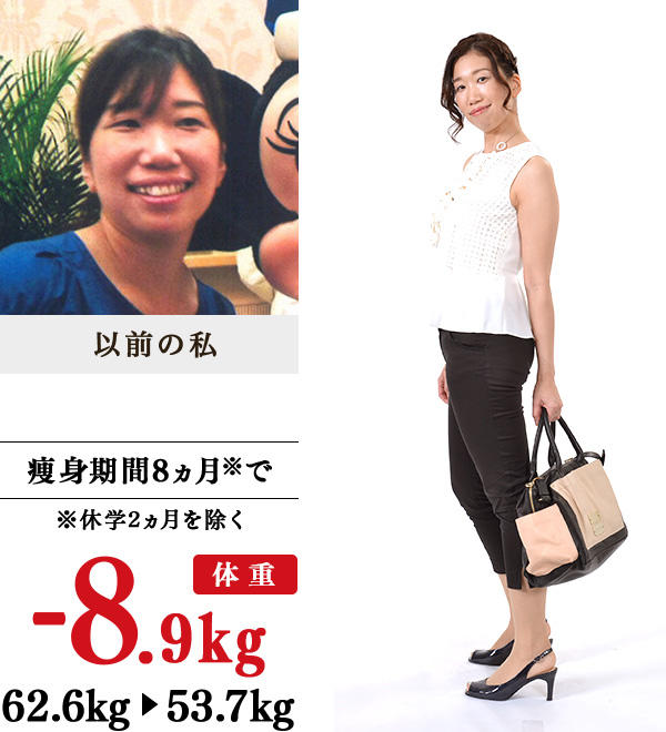 結婚後、張り切ってつくった食事を夜遅くに食べていたり、不規則な生活を繰り返していたら、毎年2kgずつ体重が増加…。疲れが抜けない体になってしまいました。いろいろと自分でも試してみましたが、一向に効果が出ず、しかしどうにか自分を変えなければという一心で、半信半疑ながらイヴに通い始めました。すると、最初の体験で大量の汗が出て、体重も落ちたので即効性を実感!先生たちの説明もわかりやすく、安心できました。家でも生活改善のアドバイスを取り入れるようになったら、変化がよりわかるようになり、さらに代謝がよくなったのか、だるさを感じることもなくなりました。5kg痩せたときには、以前感じていたようなみじめさや恥ずかしさを感じることがなくなり、久々に水着を満喫!すぐに変化が実感できる痩身法があることを、かつての私のように肥満で悩んでいる方に知らせたいと思いました。
