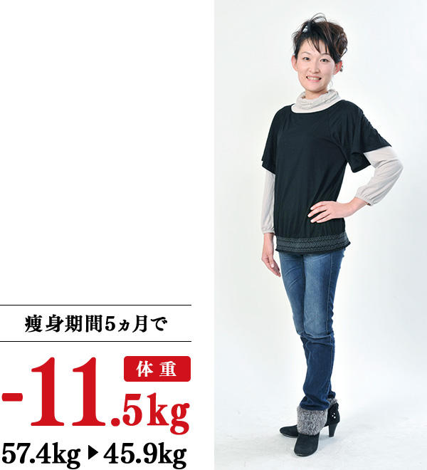40代目前に、今まで履いていたジーンズがきつくなり、30代の間に体についた余分な脂肪を落としたいと思い、以前から気になっていたイヴに入学しました。コミュニケーションが弾むオープンな教室に毎回楽しく通い、家では、たくさん食べていた夜の食事を少し減らし、野菜をたくさんとる、水分量に気をつけるなどの生活改善を心がけたら、確実に体重がダウン。半年で劇的にやせたのに、体力は落ちずに、皮膚もたるみませんでした。今では24インチのジーンズが履けるようになり、太っていた頃は辛かった、すぐに立つ&座る、小回りなどの動きが楽になりました。