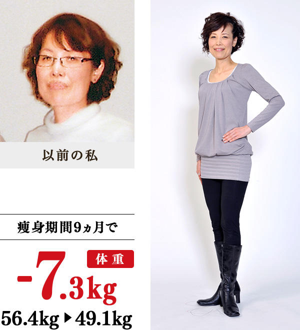 上半身に比べ、下半身が異様に太く長年悩んでいました。ジーンズの股の部分がすり切れたり、股ずれができたことも度々…。食事制限をしたら、胸だけ痩せ、脚は痩せませんでした。人生の後半に突入し、一度でよいからホッソリした脚になってみたくて、イヴへ。セルライトケアの施術を受けると、太ももの固かった肉がやわらかくほぐれ、スリムになり、とても気に入りました。いつの間にか、悩みの脚にすき間ができていて、お腹周りもスッキリし、スリムパンツやミニスカートが履けるように!健康面では、 中性脂肪値や血糖値が下がり、肌までツヤツヤ&1トーン明るくなりました。