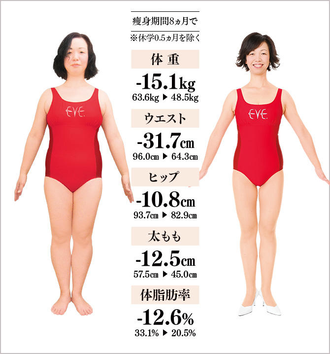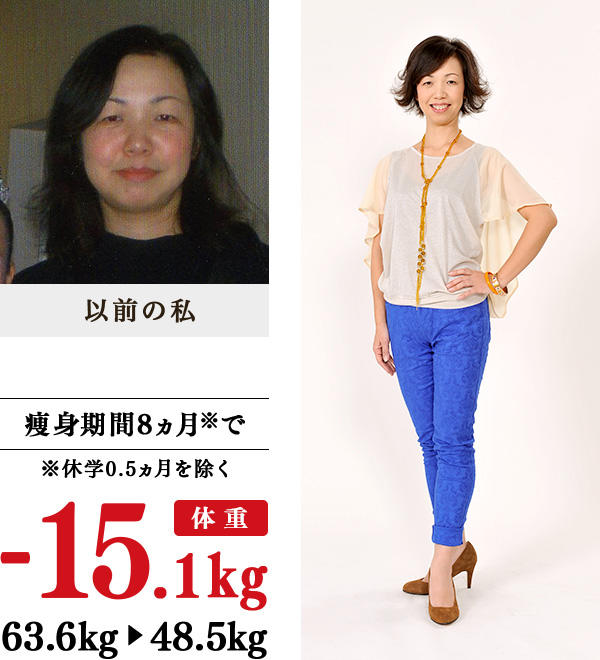 数年前から、年齢による基礎代謝の低下や女性ホルモンの乱れのせいか、体が重く気力も低下。自己流痩身で2~3kg落ちても、すぐにリバウンド…。好きな洋服も着られなくなり、もう自分ではどうにもできない、人の手を借りようと、健康やせ専門のイヴを訪ねました。生徒さん同士の会話も弾む教室に通い、15.1kgの減量に成功!洋服は、15号から7号に4サイズもダウンしました。以前、痩せていた頃もパンパンだったふくらはぎが細くなったので、ロングブーツもすんなり入ります。体と一緒に心も若々しくなったようで、職場の若い人たちとの交流も楽しい毎日。友だちから、「お洒落。さすがアパレル出身」といわれたのも嬉しいです。イヴに通い、「私のこれからの人生は明るい!」と思えるようになりました。