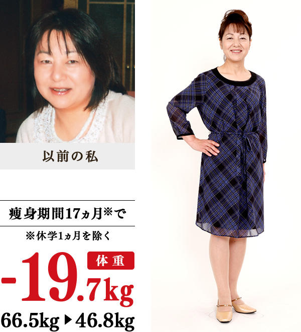 出産後から太り始め、50歳のときに人生最大体重になり、血圧も高めに…。職場でめまいがして寝込んだあと、医師から薬を処方されたのですが、飲み続けるのが嫌で、体重を落とす決意をしました。イヴでは、私の体質にあわせてその日のプログラムを組んでいただける無理のない指導と、先生方の声かけで、結果も出たので、「やる気が出る痩身」だと実感。痩せたら、薬が不要になり、メタボ健診の結果も花マルで、医師に褒められました。顔や脚などのむくみもスッキリ。体調がよくなったので、ママさんバレーのクラブチームに入会しました。