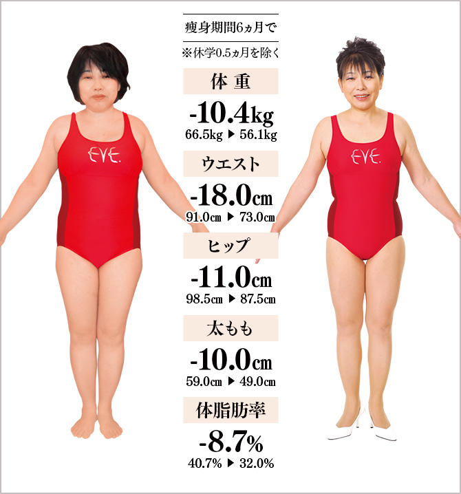 30歳過ぎから1ヵ月に1kgずつ体重が増え、出産後はお腹周りがポッコリ出た体型になりました。いろいろな痩身法を試したり、他のエステや運動にもトライしましたが、続かなかったり、少し痩せてもすぐにリバウンド…。痩身専門のイヴでは、基本の施術を中心に個別に施術を組み合わせていただけ、1回の減量数が断然多く、驚きました。とくに、気持ちがよくて、体が軽くなる経絡トリートメントはお気に入りで、他にはない技術力を実感!以前は17号を着ていたこともありますが、今は洋服をデザインで選べるようになったのも嬉しいです。もっと早くイヴで健康やせにチャレンジすればよかったと思っています。
