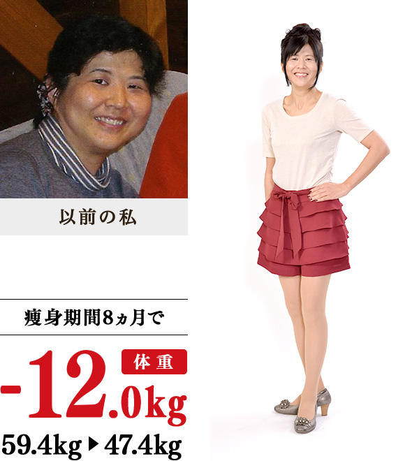 36歳頃から、加齢による体重増加と体型変化に襲われ、とくに腹囲が気になっていました。自己流で減量を試したけれども、体重のコントロールができずに困っていたときに、ホームページで中年女性も多く通っていると書いてあったイヴを知り、入学。教室の先生方は親切で、快適なトリートメントをしてくださり、12kgの減量に成功し、20代の頃の体重に!体は楽になり、ウエストまわりがスッキリし、腕と背中のぜい肉が落ちたことで、若々しい印象になったように思います。洋服のサイズは、7号になり、膝丈のスカートがキレイに履けるようになりました。周囲の若い人たちから、体型維持の方法を聞かれるようにもなりました。