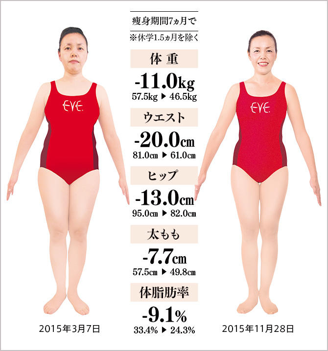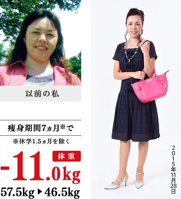 5年前、結婚や退職などの環境の変化から1年間で14kg激増…。その後、イヴに通い、15kg痩せ、念願の赤ちゃんを授かり、出産しました。今回は2度目のイヴ入学です。温かいトリートメント室がつらいときもありましたが、体を温めることは大事だと指導を受け、気持ちよい手技で、効果が実感できました。家では大豆食品をよく食べるようになり、果物や甘い物、アイスクリーム、冷たい飲み物をとるなら昼までになどの食事アドバイスを実行。最初の9回で5kg減、さらに痩せ、高校時代の体重になりました。初回のイヴ通学後にママになれたことは私の人生の宝。まだ子どもが3歳なので、これからもどんどんお洒落をしてカッコいいママでいたいです。