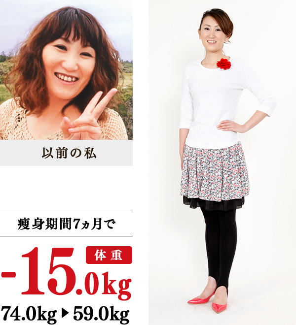 3年くらい前から食べる量が増え、バイキングも大好きになり、みるみる体重が増加…。腹囲はメタボ値で、知人からは、「病気では? 検査をすれば」の言葉。自己流痩身を試みても、1ヵ月で1kgくらいしか痩せられず、どうしてよいかわからなくなったときに、イヴに出会いました。施術を受けると汗がたっぷり出て、骨盤ケアの手技では体型変化を実感。家では、朝食抜きと夜遅い食事をやめ、半身浴も実行し、通学36回でスピード15kg減に大成功!ワンピースでお腹を隠していた私が、細身のパンツや、痩せていた頃のスーツが着られるようになり、健康面では便秘が治りました。