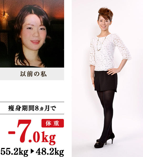 小学生のとき、クラスの男子に、「脚が太い」といわれ、初めて自分が太っていることを認識。その後、暴飲暴食と痩身を繰り返し、いつの間にか10年。その結果、上半身と下半身のバランスが悪く、痩せてもすぐにリバウンドする体になってしまいました。30歳になり、このままでいいのだろうか?健康的にスリムな体になりたいと思い、イヴを訪ねました。教室では、体を温めることの大切さや毎日の習慣も教わり、減量に成功!19〜20歳頃の、食事をまともにとらずに痩せていた頃の体重に、3食とりながらなれました。悩みの太ももがスッキリしたので、今まで履けなかったパンツや脚を出すショートパンツを履くようになり、白パンツに黒ブーツをあわせるなど、ファッションが一変しました。これからは髪を伸ばして、イメチェンもしたいです。