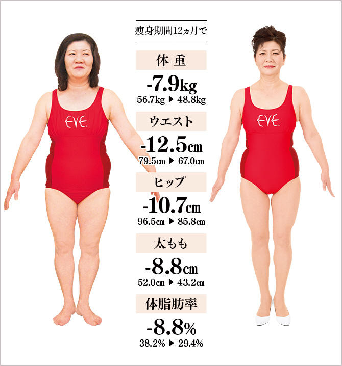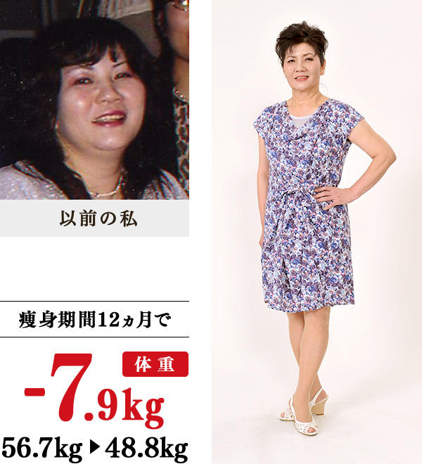 仕事に追われる忙しい毎日の寝不足とストレスで、40代半ばから太り始め、45歳で人生最大体重の59kgになりました。何度か痩身を試みたものの、いつも中途半端で挫折の繰り返し…。ほとんどの洋服がパンパンになり、年齢的にも毎日の生活や食事に気をつけなければならないと思いました。55歳の私にとって、「健康やせ」という言葉が印象に残り、イヴを訪ねました。教室では、先生方が私の臨月のような体を笑顔でケアしてくださり、痩せることができ、20代の頃の体重に!洋服のサイズは、13号から9号に変わり、ウエストの出る服を着たり、パンツも格好よく履けるようになりました。仕事中も笑顔が増え、楽しい毎日。知人に、「顔が変わった」「背筋が伸びた」といわれるのも嬉しいです。前向きに過ごせるようになり、最近ダンスを始めました。