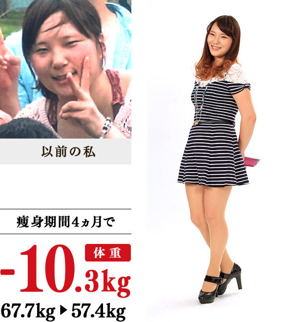 高校卒業後、運動不足と暴飲暴食が原因で太りました。親には会うたびに「痩せろ」といわれ、彼氏にも「出会った頃のほうが痩せていて、かわいかった」といわれたため、イヴへ。温かい教室で基本痩身技術を受けると、体が芯から温かくなり、終わったあとや次の日も発汗とポカポカ感が持続。家では、納豆などの豆類を必ず1日1回食べるようにし、イヴオリジナルのブラッシング体操は1日最低1回、飲んだ翌日は3〜4回行うようにしました。停滞期もブラッシング体操を多めに行うことで乗り越えられました。周囲の人に、「目が大きくなった」、「体や顔は、ひとまわり小さくなった」といわれ、嬉しかったです。