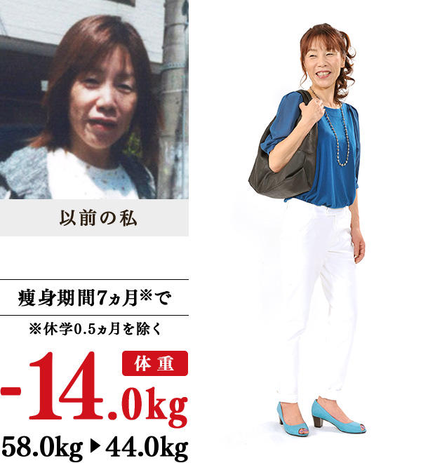 めまいから始まった体調不良が5年ほど続き、一時は寝たきり状態になり、20近くの病院を受診しましたが、原因は不明でした。症状を抑えるために飲んだ薬の副作用で、体重が急増…。自分では、痩せられないと思い、イヴを訪ねました。不安を抱えながら初回の体験に行きましたが、痩身技術の気持ちよさと、体重が減ったことに驚き、先生たちの細やかな気遣いも頼もしく感じて、これなら大丈夫そうと感じ入学を決意。温かい部屋で汗をかくことも気持ちよく、気がつけば、みるみる体重が減り、肩こりも楽になりました。体調不良のときは嫌いだった外出が、今では楽しくなり、洋服も体型を隠すものから見せる服へと、心身ともに変化。子どもを5人出産したとは思えない体型を手に入れることができました。