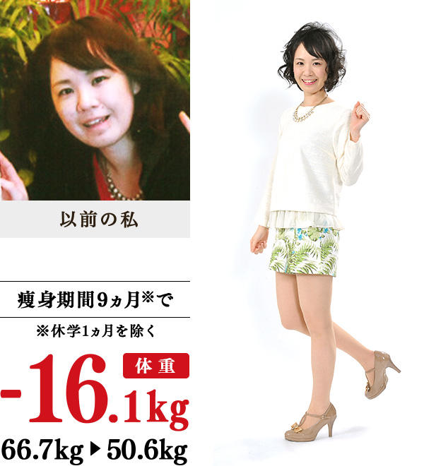 忙しい仕事と転勤による一人暮らしで、毎日のように昼夜は外食し、ご飯を大盛りで食べていたら体重が増加しました。友人や家族から、急に太ったことを心配され、同窓会への招待もあったので、転職活動のため休職していた今が良い機会と捉え、体をリセットしたいと考えました。イヴの教室はとにかく暑い!でも終わったあとのスッキリ感と肉質やラインの変化がしっかり実感できました。「朝食を少しでも食べるように」など、その人その人の問題点を指摘し、改善策を提案してくださるのもイヴの魅力。5kg痩せた頃から、発汗がよくなり、体重が落ちやすく戻りにくくなり、10kg痩せたときには、会社の制服が15号から9号に。今は、10代の頃の体重に戻ることができたので、予想以上の嬉しい痩身結果でした。