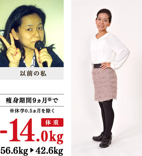 出産後、太り始めました。いろいろな痩身法を試しても、痩せられない…。諦めかけていたときに見た、イヴの広告の「健康やせ」の文字に興味がわきました。さっそく体験をしたところ、「これなら、できるかな」と実感できたので、入学。先生方の励ましは心強く、さらに会社の人たちの5〜7kg痩せたときの、「痩せたね」「頑張れ」の言葉も嬉しく感じながら、14kgの減量に成功し、小学6年生頃の体重に!疲れにくくもなったようです。今では、体型を隠さない服や、ショートパンツ、ブーツスタイルを楽しむようになりました。知人に、「顔が小さくなったね」といわれたのも嬉しかったです。毎日が楽しく、ホットヨガを始めました。