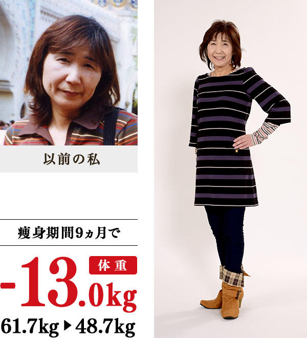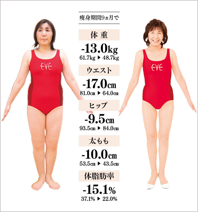 年に1度受けていた健康診断を5〜6年前から受けなくなっていたときに、会う人、会う人に、「太ったね」といわれ、初めて太ったことに気づきました。膝や腰に負担がかかり、医師からも、「痩せなさい」の言葉。そんなとき、主人が亡くなり、健康の大切さを痛感し、子どもたちのためにも自分のためにも痩せようと思い、人生初めての痩身をするために、イヴを訪ねました。オープンスペースの教室は、他の生徒さんの様子もわかり、私も頑張ろうという気持ちになりました。13kgの減量に成功したら、20歳頃の体重になり、洋服は9号が着られるようになりました。スキニーパンツなど、お腹やお尻を隠す服から、スッキリ見せる服に変わりました。毎日、気持ちもハッピーです。そんな私を見て、娘が八王子教室に入学しました。