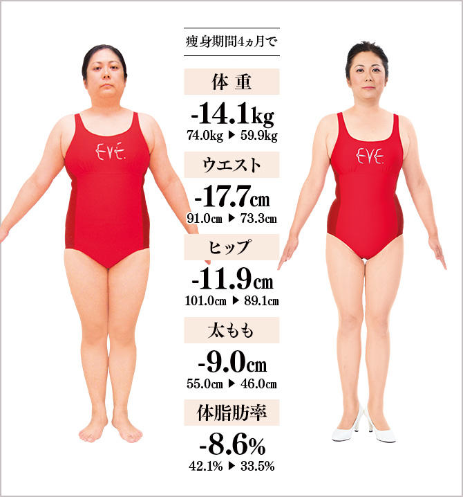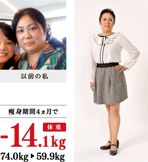 27歳で橋本病になり、体重が20kg以上増加。当時の夫に、「一緒に歩きたくない」といわれ、このままでは自分が駄目になると思い、離婚…。父が糖尿病で、私も健康面に不安を感じたことと、40歳前に、もう一度、女性として花を咲かせたいと思い、痩身専門のイヴを訪ねることにしました。8kg痩せたときに、1ヵ月くらい停滞期がありましたが、店長の心に響く言葉で乗り越え、14.1kgの減量に成功!洋服は、17号から11〜9号に3〜4サイズもダウンし、体のラインが出る服やワンピースを着るようになりました。異性を好きになることができ、大好きな人にプレゼントを渡して一緒に写真を撮り、幸せな気持ちになれました。イヴで前向きな自分になり、もう一度、結婚をしたいと思っています。