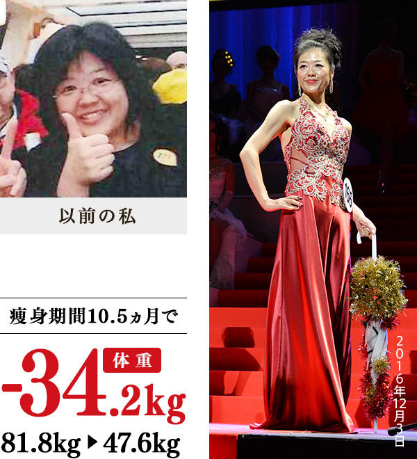 「今は大丈夫でもそのうち膝に支障が生じる」と人にいわれ、会社の先輩が通っていたイヴに入学しました。エステは楽だと思っていたのに意外と体力を使い、体調がすぐれない日は少しキツく感じましたが、結果が出るのはすごいと思いながら通学。自宅では、果物は昼までに食べる、温かい飲み物を飲む、よく噛むために飲み物をゼリーや寒天で固めるなどの食事指導を実行しました。通学6回で−5kg、18回で−10kg、27回で−15kgと順調に痩せ、20kg痩せたときの健康診断では、体重やサイズが変わり過ぎたことで何度も名前を確認され、25kg減量後は洋服のサイズが17号から7号に激変。さらに中学生時代の体重まで痩せたら、食事のお誘いが増えました。