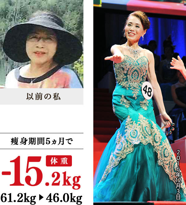仕事は健康診断の検査員。太い体、高い血圧では受診者への説得力がない…と後ろめたさを感じていたときに、仕事仲間に誘われ、イヴに体験に行きました。室温を高く設定して発汗を促し、代謝を上げるという理にかなったシステムの教室で、痩身技術を受ければ、結果を実感。自宅でも、しょうがを活用し、温かい飲み物か冷たい物を飲んだ後には白湯も飲む、夜は果物を控えるなど、体を冷やさない食生活を実行しました。通学7回で5kg痩せた頃から血圧が標準値になり、28回で10kg減量後は、多くの人から、「若々しくなった」と褒め言葉をいただき、15kg減量後は1日立ち仕事でも脚のむくみや痛み、膝の違和感を感じなくなり、健康を実感しています。