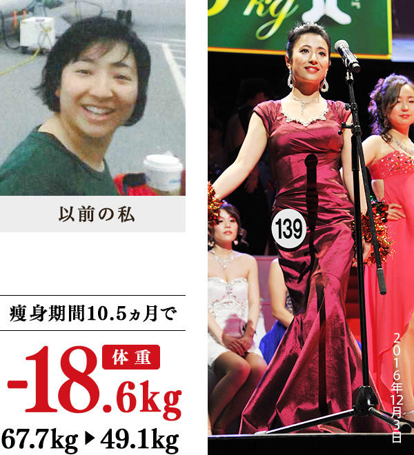 ここ2〜3年でおばさん体型に…。このままでは自分が嫌いになると焦ったときに、運動でぎっくり腰になり、体力の衰えも痛感したため、イヴに入学しました。オープンフロアの教室は、慣れると顔見知りができるのが魅力で、温かい室温はホッとするうえに、のどにもよい環境だと実感。入学後、先生たちのアドバイスで自分の体質を知ったことで、しょうが入りの温かい飲み物を飲んで冷えに対して気をつけるなど、私にあったダイエットを考え、実践しながら、最初の通学11回で−5kg、27回で−10kg!さらに痩せ、小学校6年生頃の体重になりました。前向きになり、姿勢を意識したり、食事や肌ケアに気をつけたりと、美しくなる努力も楽しむ日々です。