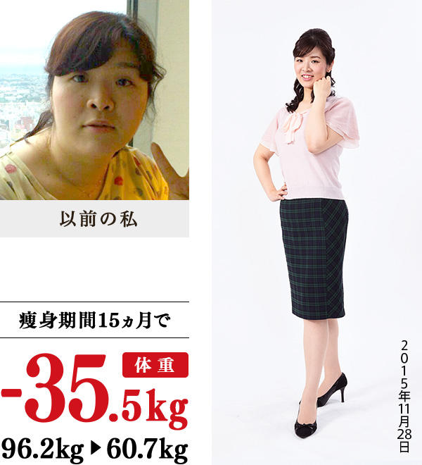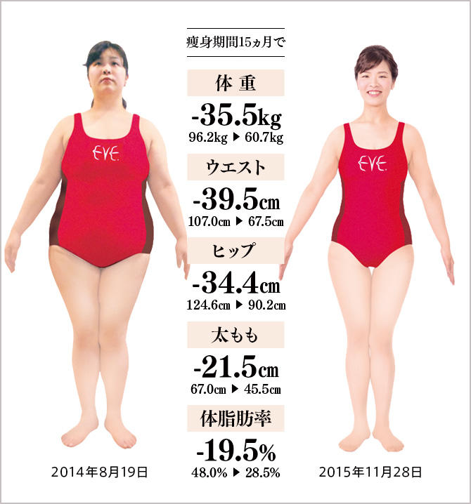 小中学生時代に2回も肥満で入院してダイエットにトライしたもののリバウンドし、22歳のときに人生最大の108kgに…。ジムに通ったけれども2時間の筋トレと有酸素運動がキツくて続きませんでした。30歳目前に原因不明の体調不良に悩まされていたときに、母に知人が痩せたというイヴを勧められ、体験へ。最初は先生の「30kg減らしましょう」の言葉が半信半疑でしたが、温かいトリートメント室にいるだけで汗が出て、毎回体も変化し、スゴイ技術だと実感できました。最初の1ヵ月で7.1kg減、2ヵ月弱で10kg減、その後30kg痩せた頃に久々に恋をし、毎日輝いた気分に!以前より疲れにくく、体調がよくなりました。次の目標は40kg減です。