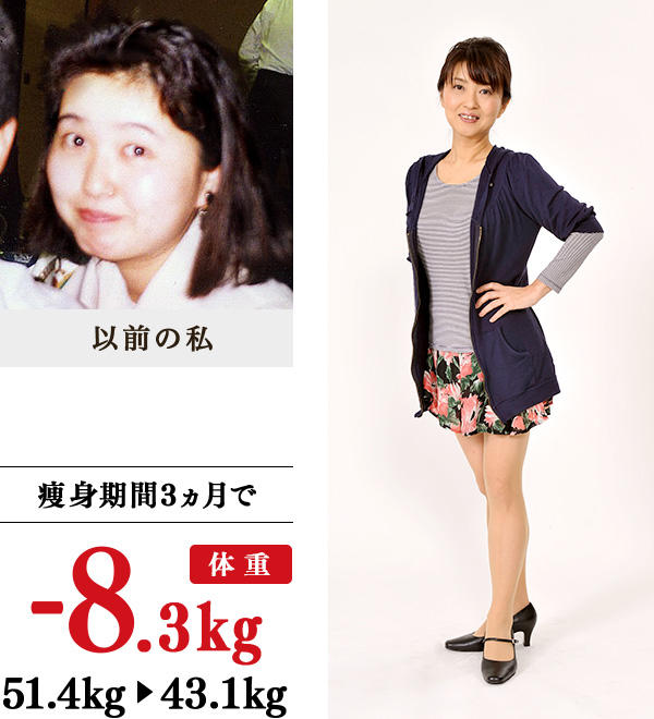 2人目出産後太ったけれども、その後、痩せ、51〜53kgをキープしていました。昔から実年齢よりも若く見られることが多かったのですが、ここ何年かは、そういわれてもお世辞にしか聞こえず、鏡に映る自分に自信が持てずにいました。そんな中、イヴの広告が目にとまり、1〜2kg痩せれば少しは自信を取り戻せるのではと思い、訪ねました。教室で、先生方に励まされながら、減量し、小学5〜6年生頃の体重に!洋服のサイズは、7号になったので、ウエストインしたり、体のラインが出る服装をするようになりました。フェイスラインもスッキリしたようです。イヴで新しい自分と出会い、外出やショッピングが楽しくなったので、これからはファッションをもっと楽しみたいです。