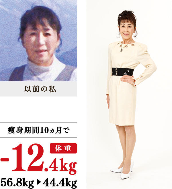 60代前半から太り始め、お腹や二の腕が気になっていました。食事を1日1食のみにしてみたけれども、逆に、がむしゃらに早食いをして、体重が増加…。健康面の不安もあったので、イヴに入学しました。今まで汗をかかなかった私が、温かい教室では汗が出るようになり、12.4kgの減量に成功し、57年前の学生の頃の体重に!洋服は、最大時13号、入学時11号から9号に変わり、体にピッタリあった服を着るようになりました。気になっていたお腹や二の腕も細くなり嬉しいです。実年齢をいうと皆、びっくりし、「50代後半〜60代前半に見える」といわれたのも嬉しかったです。これからも気持ちを若く持ち、たくさんのお茶のみ友だちをつくりたいと思います。