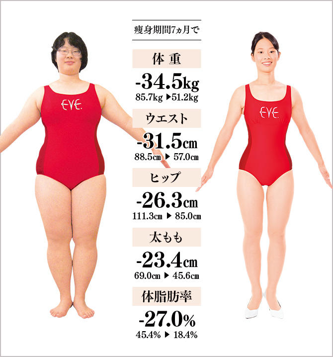大学院を卒業し、社会人になった節目の年の4月に出会ったイヴ。イヴに通うことが私の生活の楽しみの一つになりました。減量成功後は、今まで興味もなかったメイク用品を買いそろえ、初めてコンタクトレンズにしました。何事にも自信を持って取り組めるようになったので、富士山に登りたい、資格を取りたいなど、次の目標もあります。イヴは私の救世主です!
