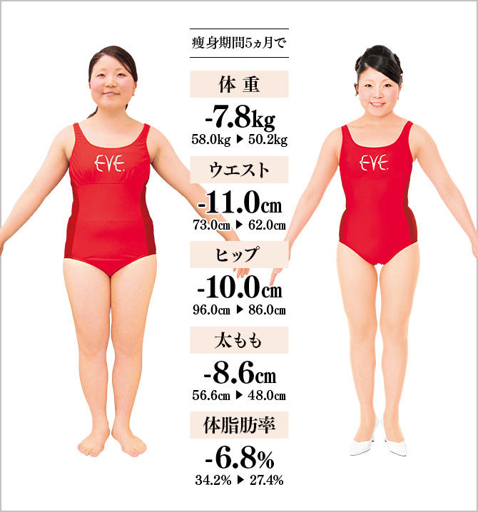 幼い頃から肥満体型。けれども28歳に至るまで、一度もしっかりとした痩身に取り組んだことがありませんでした。今回は、婚約をしたため、このままの体型では人前に出ることはできないと思い、イヴに通うことを決意しました。教室では、一生徒に過ぎない私に、親身になり、一緒に喜んでくださる先生方のサポートと熱意と情熱をとても心強く感じながら、減量することができました。洋服のサイズは、最大時15号、入学時13号から9号に変わり、少しスカート丈を短くしたり、トップスをウエストにインするようになりました。結婚式では、可愛いウエディングドレスを着て、お姫様だっこをしてもらいます。