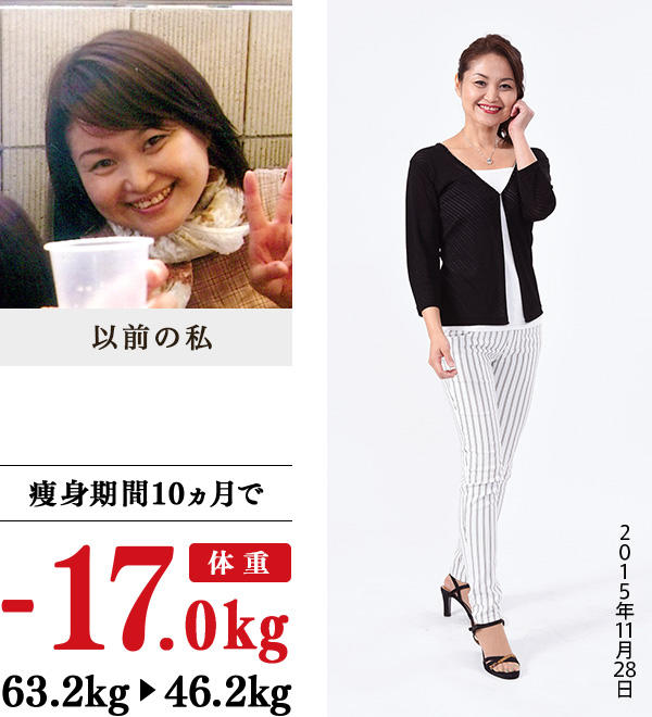 生まれつき脚の関節が悪く、医師からは体重を増やさないようにといわれていました。ところが3人目出産後、体重が増え続け、関節の痛みが限界に達しました。自力では体重は落とせなかったため、プロの手を借りることに。いつも前向きでモチベーションを上げてくれる先生たちにボディケアしていただき、家では煮物やサラダで野菜を多くとる食事や、長めの半身浴とイヴオリジナルのブラッシング体操はお腹まわりを回数を増やして行いました。早めに寝るようにも心がけたら、膝の痛みを感じなくなり、身軽に動けるように!5年以上タンスの肥やしだった洋服がすべて着られたことにも驚いています。イヴならつらいと思われがちな痩身が楽しく続けられました。