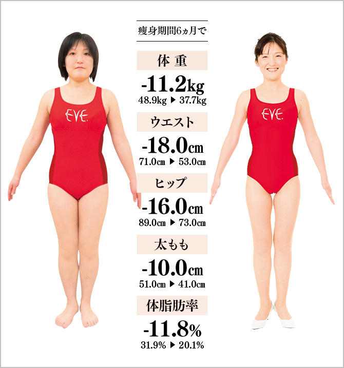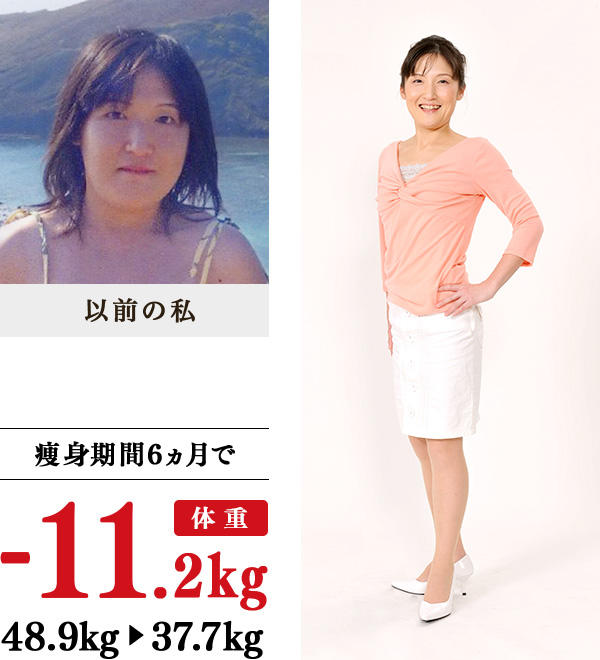 過労で発熱し、1ヵ月くらい微熱が続き、だるくて全然動けないのに、ストレスで食べる量が増えた時期があり、体重が増加しました。水中ウォーキングを1ヵ月くらいしたけれども、全然効果なし…。ゆるかったパンツがキツくなり、スカートのジッパーも締まらなくなったので、イヴを訪ねました。和気あいあい、雰囲気のよい教室に通い、11.2kgの減量に成功し、高校1年生頃の体重に!洋服は7号サイズになり、ウエストラインや脚が出る服を着るようになりました。太ももにはすき間ができ、ふくらはぎはサイズダウンしたので、太ったことで履けなくなっていたお気に入りの短パンや、人からいただいたけれどもジッパーが締まらなかったロングブーツも履けるようになりました。
