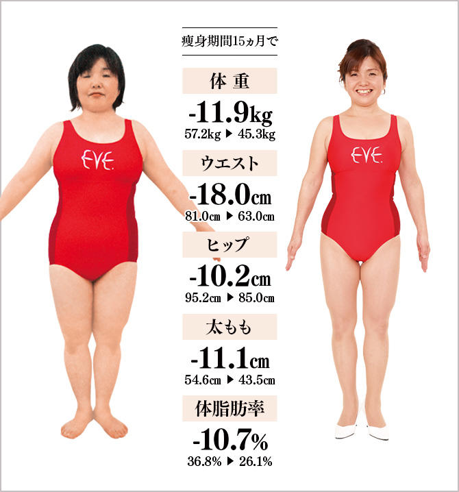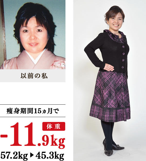 30代後半から少しずつ太り始め、食事制限とリバウンドを繰り返しているうちに、長男妊娠時の臨月よりも重い体重に…。主人に、「その体をなんとかしたら」といわれてしまい、勇気を出して初エステのイヴを訪ねました。先生方は、明るく親切だったので、安心して通学。和食中心の食事を3食しっかり食べるという指導で、食べながら健康的に痩せることができ、二重あごがなくなりました。健康面では、肩こりや腰痛が改善。洋服は、体のラインが隠れる13号から、9号のフィット系やミニスカートに変わりました。痩せてから、京都で舞妓さん変身も楽しみました。