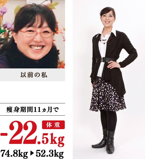 更年期と、職場での資格試験の受験勉強のストレスで人生最大体重に…。試験には合格したものの、動悸、息切れ、めまい、腰痛、膝痛で、体を動かすことさえだるくなり、一大決心をし、イヴに入学しました。教室では、先生方に励まされながら、体のリンパの流れがよくなると感じられる施術を受け、家では、食事や水分のとり方に気をつけ、最初の通学8回で5kg減、19回で10kg減!さらに痩せ、大幅減量に成功したら、体調がよくなり、寝起きや出勤時も快調、外出も楽しくなりました。病気の宝庫だった自分と訣別でき、さらに、肌がツルツルになり、目鼻立ちがはっきりしてきたのも嬉しいです。