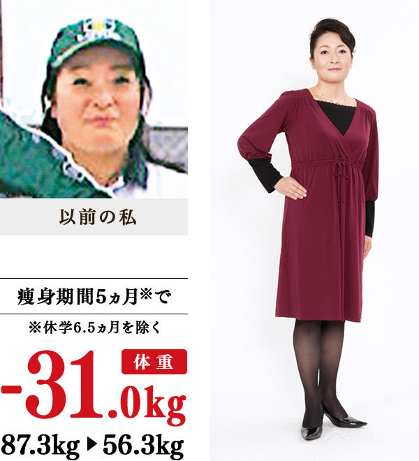 仕事のストレスとうつ病の薬の副作用で、過食が止まらず、人生最大の87kgに。ダイエット食品で、半年で痩せたけれども、胸まで痩せ、リバウンド。母親に、顔をあわせるたびに、「大仏みたい」といわれる日々…。退職を機に一念発起し、東洋思想のイヴへ通うことにしました。代謝が下がる40代の私でも、質の高い技術で、通学6回で10kg減、10回で20kg減、23回で30kg減し、メリハリラインに!コレステロールや中性脂肪が理想値になり、熟睡できるようにもなりました。顔も赤みが減り、小さく。気持ちも前向きになり、外出が億劫でなくなりました。