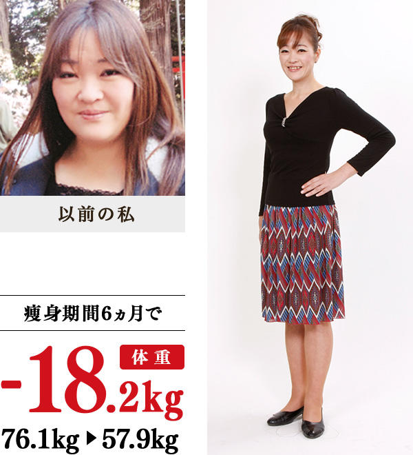 出産後から太り始め、40歳のときに人生最大体重に。元々高かった血圧が体重増加とともにさらに上昇し、目がまわったり、献血も断られる始末…。ジム通いで痩せたものの停滞し、その時期にイヴと出会いました。体調にあわせた施術を選んでいただけることが痩身の近道だと感じ、食事も毎回、悩みに応じたアドバイスだったので、無理なく、食生活の改善にも成功。最初の通学9回で5kg減、16回で10kg減のスピード痩身ができました。痩せたら、血圧は理想値になり、お洒落面では、ラインや首周りの出る服、ミニスカートを楽しむようになりました。