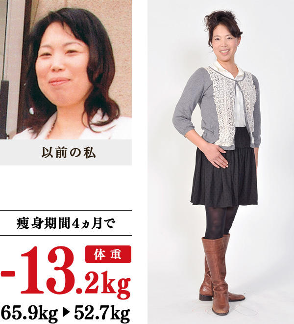 6年前から体重が増え、写真に写った背中を見たら、一回り大きくなっていました。食べても太らない主人に詐欺師扱いされ、子どもからも、「痩せたら」の言葉。膝痛や、洋服が着られなくなったことにストレスを感じたため、自己流痩身をしたけれども、リバウンドの繰り返しでした…。教室で施術を受けると、全身の血行がよくなり、脂肪がほぐれていくのがわかり、「本当に痩せる」を実感。家では、食事抜きをやめ、半身浴などのアドバイスも実行。痩せたら、膝痛がなくなりました。洋服選びも楽しく、娘のミニスカートも履けるようになりました。