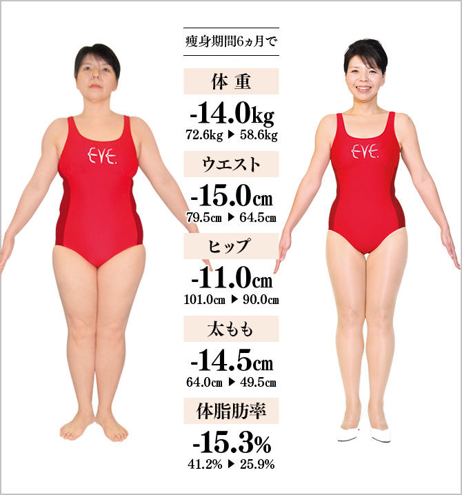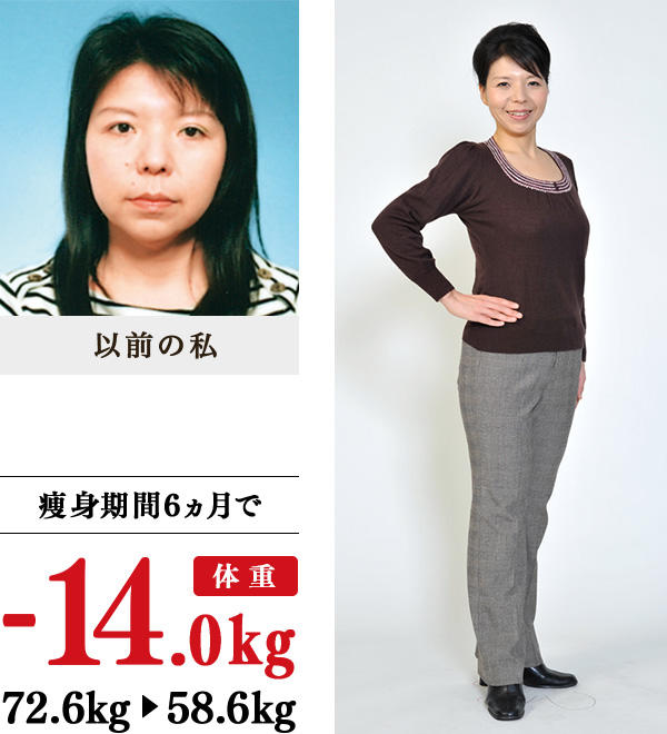 幼稚園の頃から肥満児で19歳のときには、人生最大体重の89kgに。スポーツクラブやエステに通っても、60kg以下になることはありませんでした。その後、結婚し3人の子どもに恵まれましたが、自分のことは後回しになり、気づけば40代に。体重は増える一方だけれども自力では痩せられなかったため、イヴに入学しました。教室での施術プラス、先生方に教わり、腹持ちのよいスープ類をよく食べるなど食事にも気をつけたら、成人後、初めての60kg以下になり、長年のコンプレックスを克服!肌にもツヤがでました。細身のパンツも楽しんでいます。