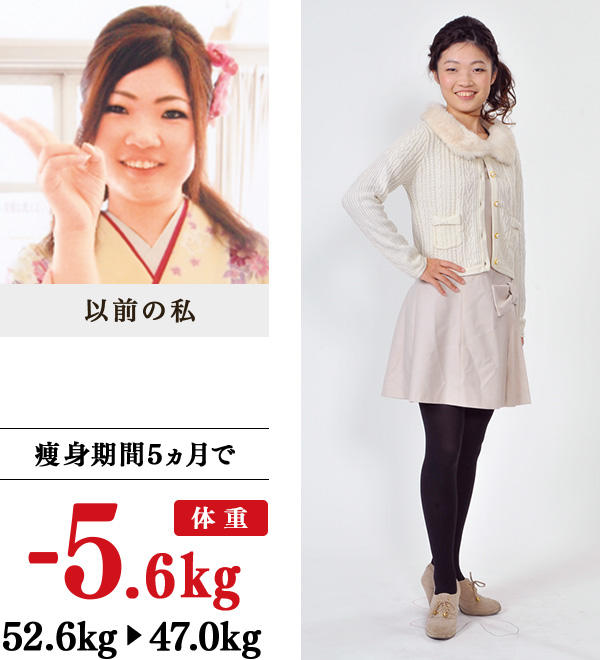 高校時代の部活の先輩に久々に再開したときに、「いつの間にこんなにセルライトがついたの?」といわれ、太ったことを再認識し、イヴに入学しました。その日の体調にあわせて施術内容を考えてくれるシステムが画期的で、1回で確実に700g以上落ち、「痩せた!」を実感。家では、3食バランスよく食べ、半身浴などを行った結果、深夜勤務のある私でも、気になっていたウエストにくびれができ、太ももにすき間もできました。洋服は、Sサイズが余裕で入るようになり、脚のラインがわかるショートパンツやパンツスタイルを楽しんでいます。以前は不規則な仕事柄、体調を崩しがちでしたが、イヴに通ってからは、体調を崩すこともなくなりました。