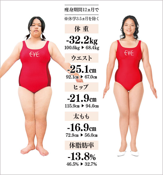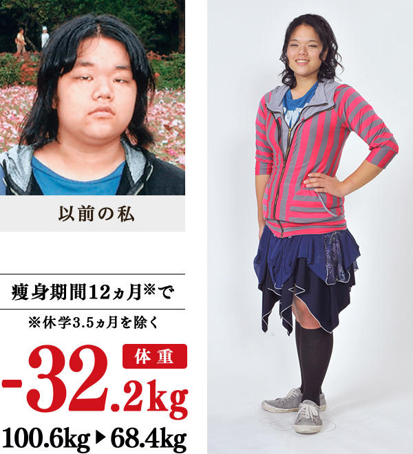 幼少期から太っていて、その後も間食と、父の晩酌のつまみを食べる生活をしていたら、体重が100kgを超えました。洋服は、レディースの3LかメンズのL。膝痛で体育の授業を休んだことも…。そんな私を心配した母がイヴを見つけ、一緒に入学してくれました。教室での施術プラス、家では食事のとり方に気をつけ、ブラッシング体操は1日1回実行。通学5回で5kg減、15回で10kg減、31回で20kg減…と順調に体重が減り、可愛い洋服やミニスカートが着られるようになりました。さらに、目標体重までイヴで健康やせを続けます。