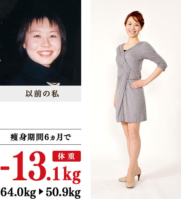 ガッチリ体型で、太ももは父と同じくらいの太さ…。数年前に痩身に成功し、ブライダルモデルの仕事をしたけれども、ヘルニアの手術後、リバウンド。その後も、人にスタイルを褒められることがありましたが、自分で納得できなかったため、イヴに入学しました。教室で施術を受けると、たっぷり発汗し、脚がスッキリするなどの効果を実感。家では、朝食をきちんと食べ、蒸し野菜や魚、酢をとるように心がけたら、肌のツヤまでよくなり、停滞期もなく順調に体重減。洋服は、ピッタリ系やスキニー、ミニスカートが着られるように。自信が持てるようになったので、休んでいたモデル事務所のレッスンも再開しました。
