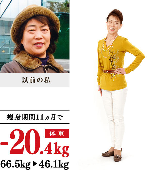 腰痛や肩こりで悩んでいたときに、イヴで18kg痩せた娘に勧められ、人生初痩身にトライ。冷え性で血流も悪い状態でしたが、教室で施術を受けると、汗がたくさん出て気持ちがよく、体が軽くなりました。家では、パンよりもご飯を食べるようになり、ブラッシング体操や入浴中にマッサージも実行。教室には週2回通い、他の生徒さんから、「痩せたね!」と驚かれることも励みになり、最初の1ヵ月で6.2kg減、3ヵ月で10kg減達成!さらに痩せたら、冷え、肩こり、腰痛が解消し、肌もツヤツヤに。洋服は、体型を隠す羽織りものや15号から、ピッタリ系の7号に激変しました。