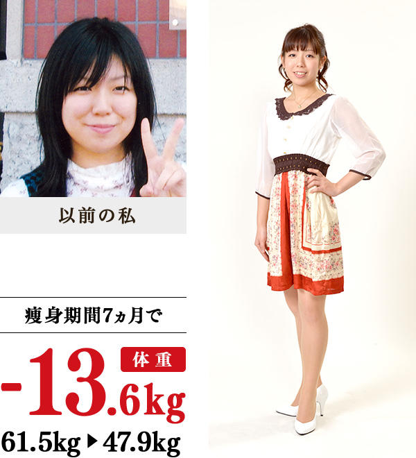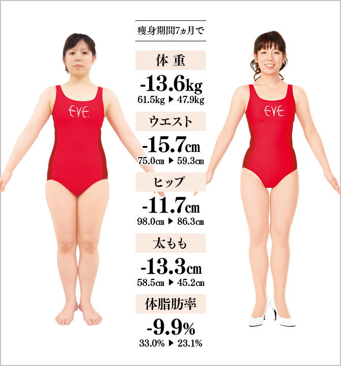 今までに一度も痩せていた時期がなく、周囲の人に妊婦さんに間違われたこともあり、本気で痩せなきゃ!と思い、イヴへ。1回の施術で効果が実感できるので、次回も頑張ろうと思え、大嫌いだった汗をかくことにも気持ちよさを感じるようになり、確実に3kg、5kg、7kgと痩せていきました。見ているだけでもイライラし、ストレスを感じていたガチガチの太ももがやわらかくなり、すき間もでき、細身のジーンズや履きたいパンツも楽しめるようになりました!脚へのストレスが解消されたら、気持ちまで前向きになり、新しい仕事を開始。職場の人に、「細いね」「キレイだね」といわれています。