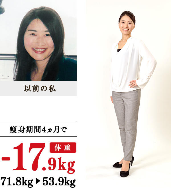 結婚後、家にいることが多くなり、運動もしない生活が続いたら、みるみる体重が増え、ぽっこりお腹、デカ垂れ尻、すき間のない太ももに…。主人には、「こんなはずでは…」と詐欺扱いされ、健康診断の結果も要観察となったため、イヴに入学しました。冷え体質の私には、あたたかい教室はホッとできる場所で、ホームケアや食事の細やかなアドバイスも実行したら、最初の1ヵ月で6.6kg減、2ヵ月で10kg減!さらに痩せたら、不順だった生理が定期的にくるようになり、健康診断の結果も良好に。吹き出物がなくなり、肌までツヤツヤになりました。身近な人たちも喜んでくれ、主人と外出することも増えました。