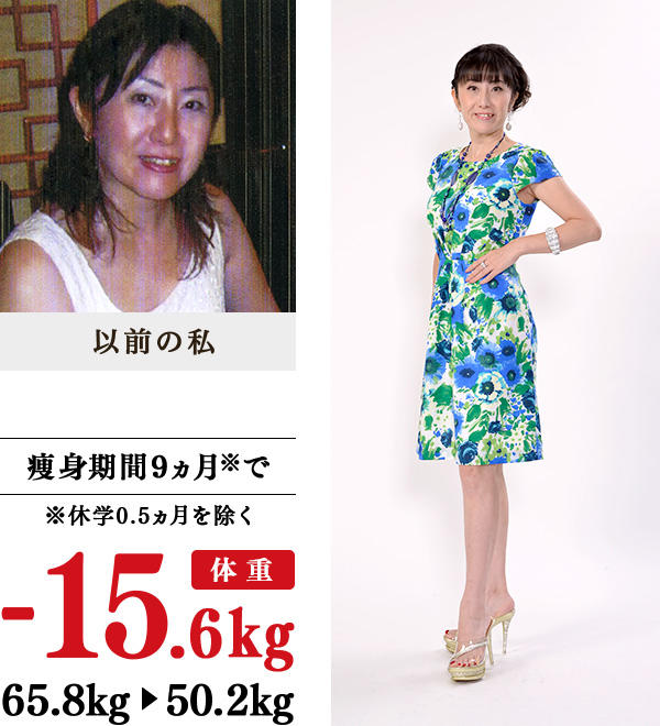 30代後半に、仕事の転勤、昇格、部下の実績管理に伴うストレス太りで、毎日800gずつ体重が増加。68kgになったときに、人相が変わり、慌てて絶食をしたらリバウンド…。彼の、「昔は鎖骨があったよね」「お相撲さんのよう」の言葉で一念発起し、イヴを訪ねました。アットホームで温かい雰囲気の教室に通い、15.6kgの減量に成功し、成人後最軽量に!9号も入るようになったので、可愛い服装や昔のスカート、今まで絶対に着られなかったブランドの服も着るようになりました。彼から、「くびれができたね!」、昔の同僚に、「昔よりキレイになった!」といわれたのも嬉しい限りです。整理収納アドバイザーにチャレンジしたので、次はコンサルタント職までめざします。